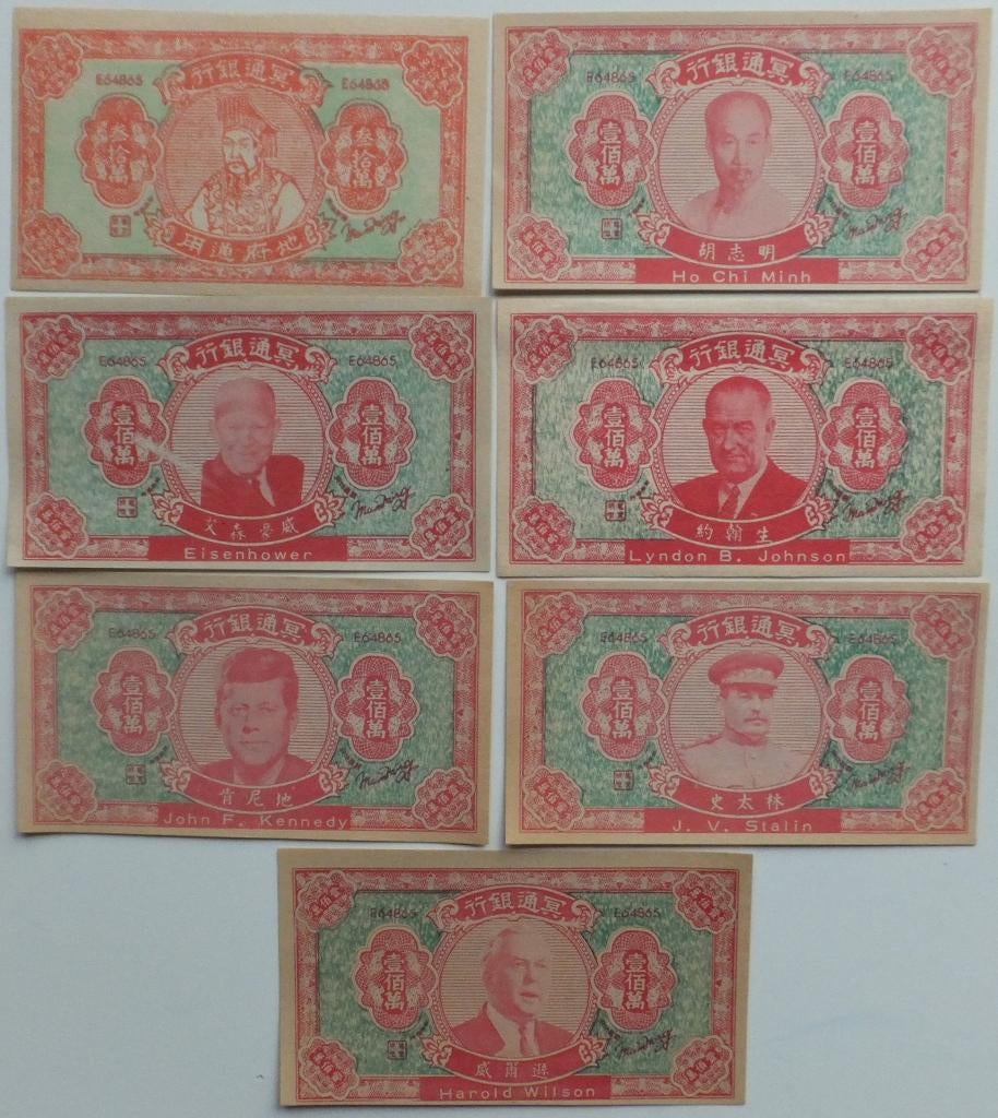 17 feb 26HetbiljetjeVeenendaal - China bankbiljetten 2 Hell bank Notes (Offergeld) misdrukkenChina bankbiljetten 2 hell bank notes (offergeld) misdrukken. Biljet ho chi minh met sterk verschoven groene ornamenten en biljet n.s. Khruschev volledig versneden waardoor naam boven i.p.v. Onder. InOphalen of Verzenden Oost-Azië