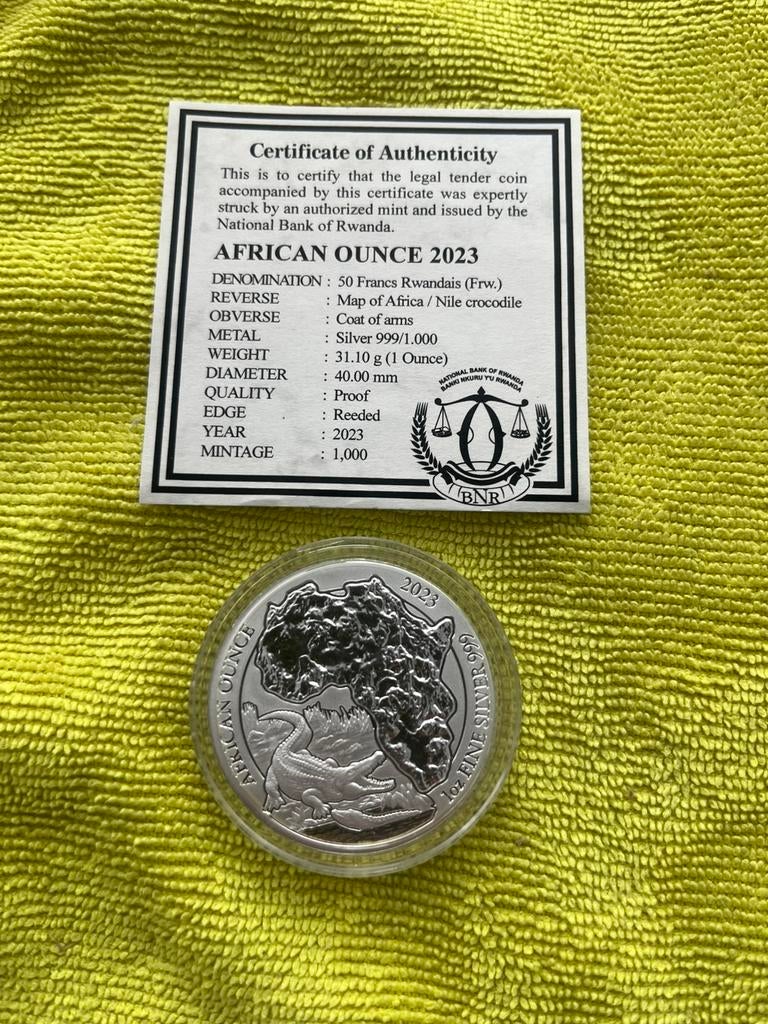 4 apr 26TopadvertentieCatawikiHeel Nederland - Ruanda 🇷🇼Wildlife Krokodil 🐊2023.Ruanda wildlife crocodile 🐊 2023. Puur zilver in originele capsule en certificaat.Ophalen of Verzenden