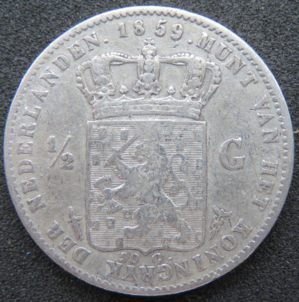 Verken de Halve Gulden 1859, geslagen van 945/1000 zilver. Deze unieke munt is een waardevolle aanvulling voor elke verzameling munten of postzegels.