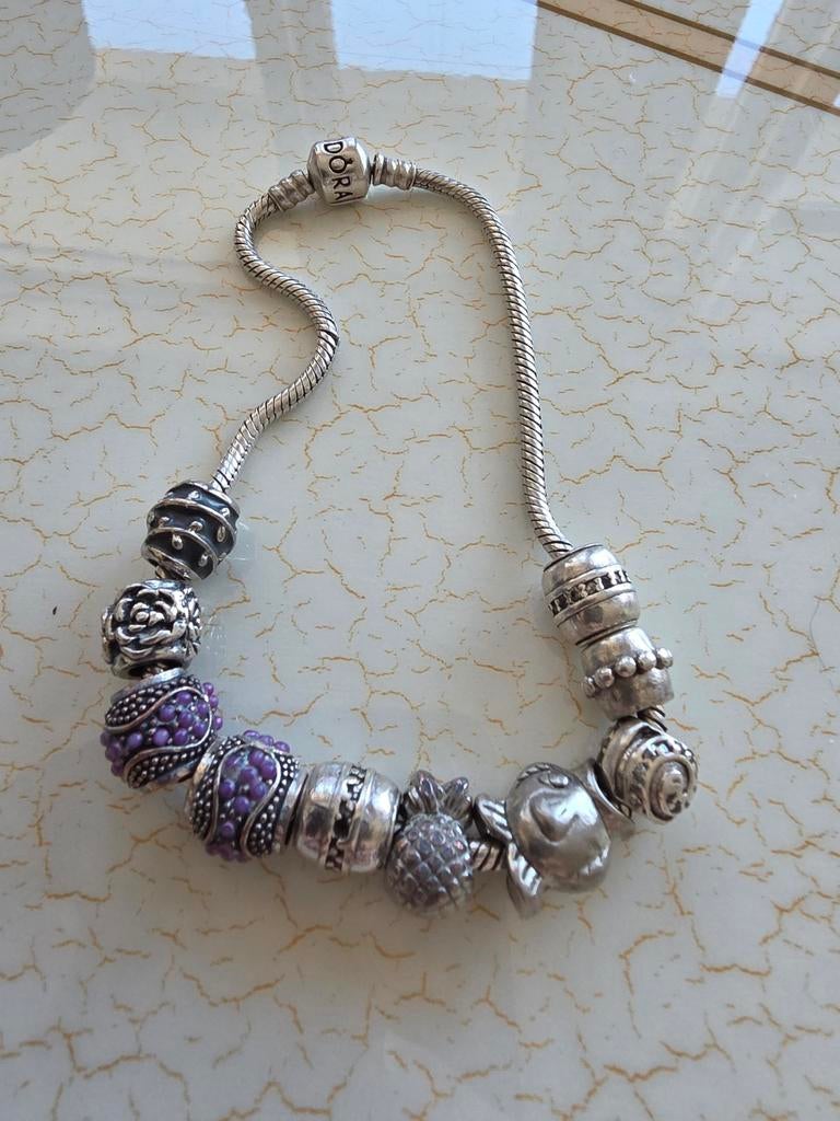 - Zilveren Pandora 8 maal bedels armbandEen zilveren 925 pandora armband met verschillende bedels 8 maal. Er zitten bedels bij met paarse accenten en diverse zilveren bedels met verschillende patronen. Armband is ook 925 mooie stevig armbanZo goed als nieuw Ophalen of Verzenden