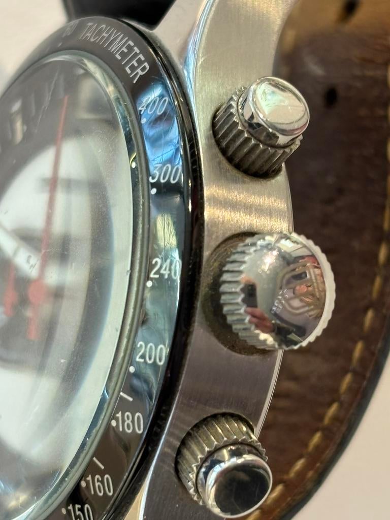 - Profuomo horlogeChronograaf profuomo met zwart/witte wijzerplaat en zwart leren bandje. Schroefkroon en schroefdeksel. En datumaanduidingOphalen of Verzenden