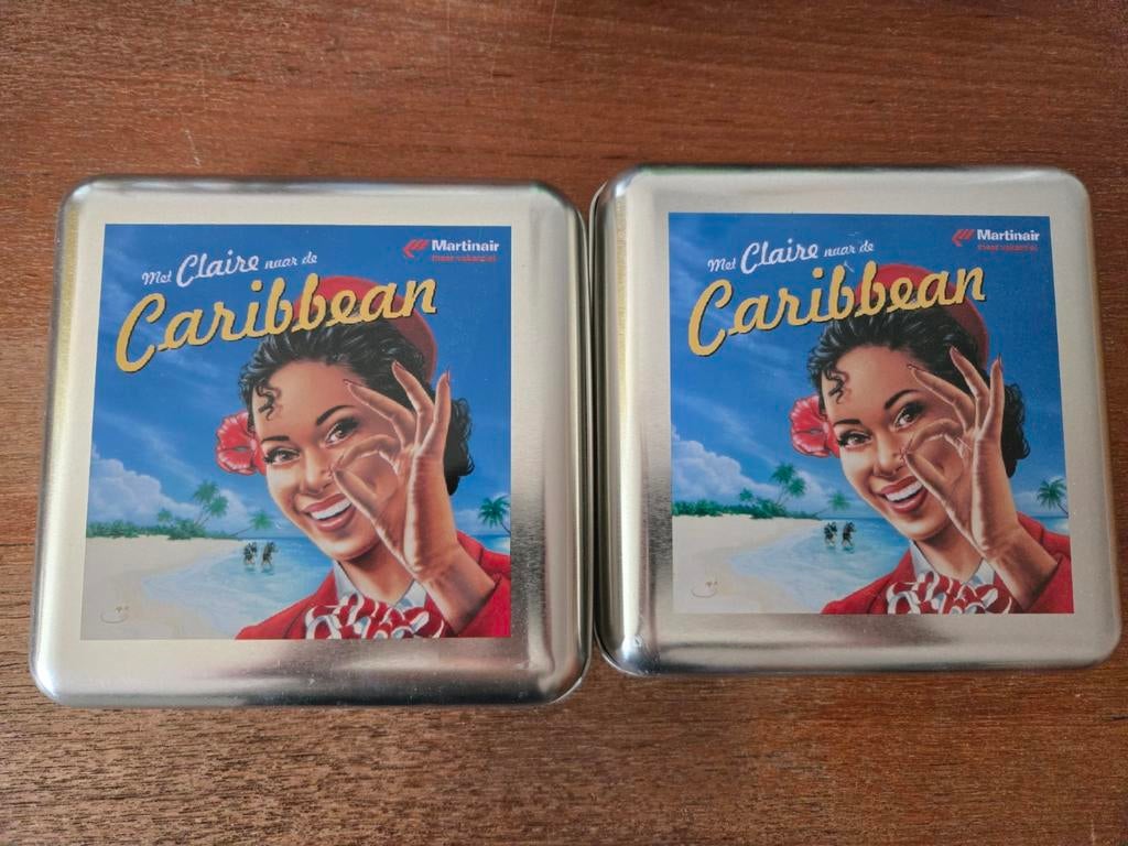 - 2 Martinair blikkenTwee blikken van martinair met een afbeelding van een vrouw op het strand. Met claire naar de caribbean. De blikken zijn rechthoekig en hebben een zilverkleurige rand. Ze zijn beide hetzelfde. 5 EuroGebruikt Ophalen of Verzenden