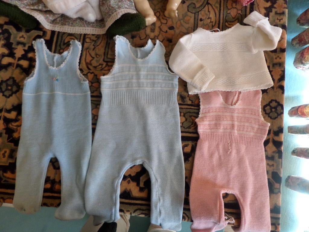 - oude poppenkleertjes voor babypoppenDe katoenen kleertjes (4 stuks) samen 20 euro. De drie slobbroeken voor 10 euro; het witte luiertruitje kost apart 10 euro. Het gebreide vestje past een popje van 35 cm, voor 5 euro. Totaal 25 euro plGebruikt Ophalen of Verzenden