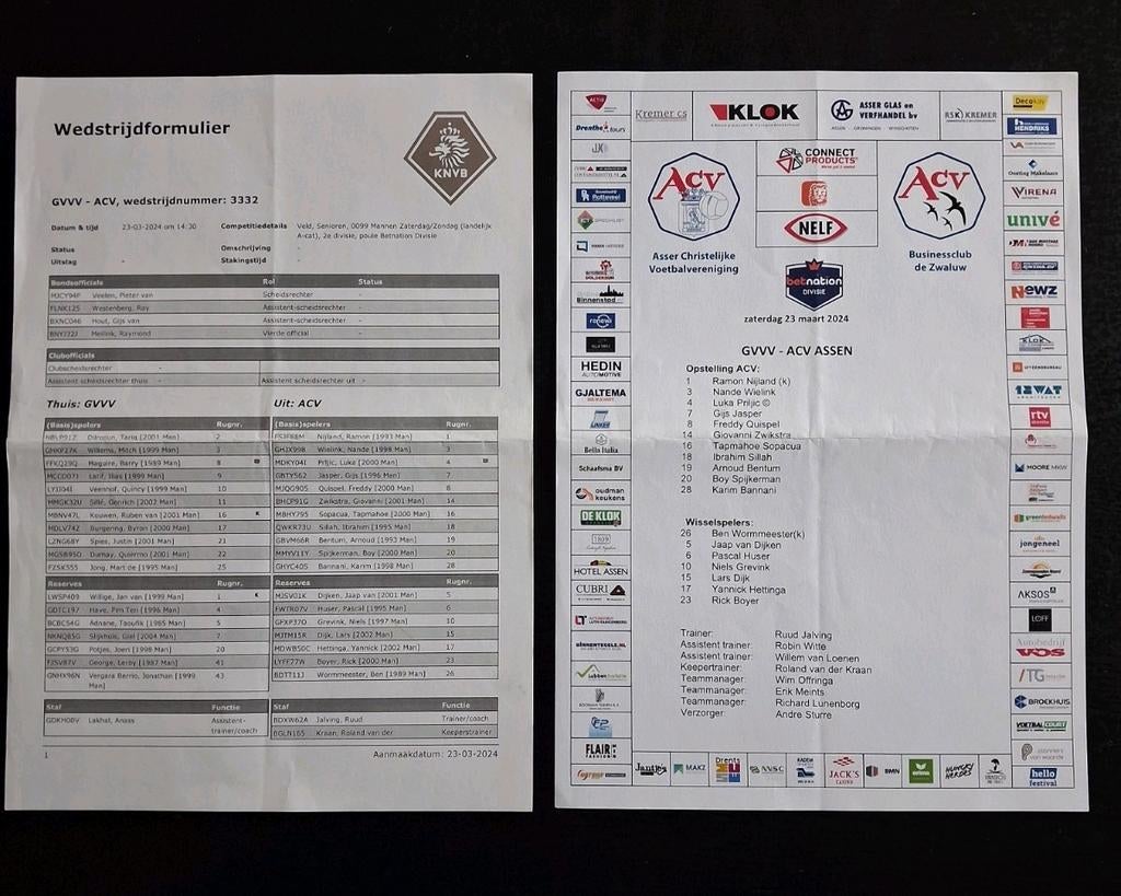 - Amateurvoetbal. GVV - ACV Assen 23-03-2024.Amateurvoetbal. Wedstrijdformulier en opstellingen gvv veeendaal - acv assen gespeeld op 23 -03-2024. Verzenden is voor risico koper.Zo goed als nieuw Ophalen of Verzenden