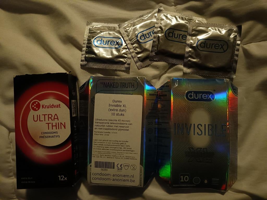 28 mrt 26KasperEindhoven - Ultra thin condoomsUltra thin condooms. 12X ultra thin (kruidvat). 24X invisible xl (durex). Tht 04/2027.Verzenden