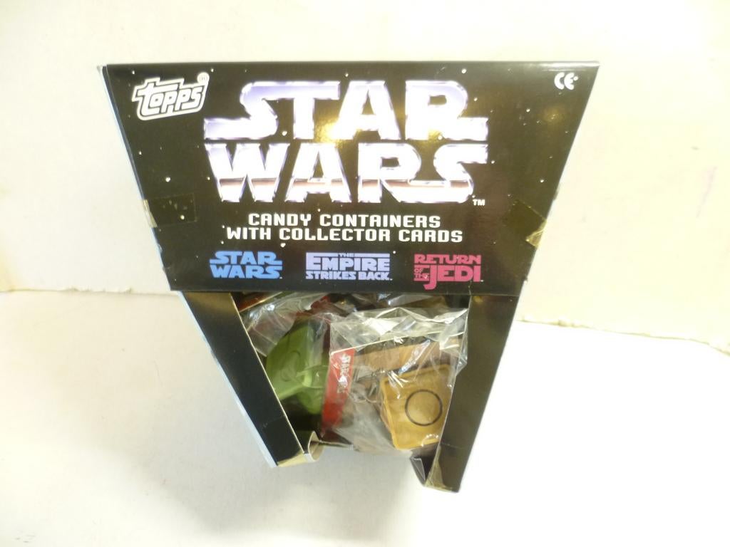 12 feb 26R2D2kkerAlkmaar - Star Wars Topps Candy Containers met 12 hoofdjesStar wars topps / wacky workshop : candy containers met 12 hoofdjes met een tradingcard. Hoofdjes allemaal nog ingepakt de doos heeft betere tijden gezien en plakband laat los zie fotos. Zou de snoepGebruikt Verzenden