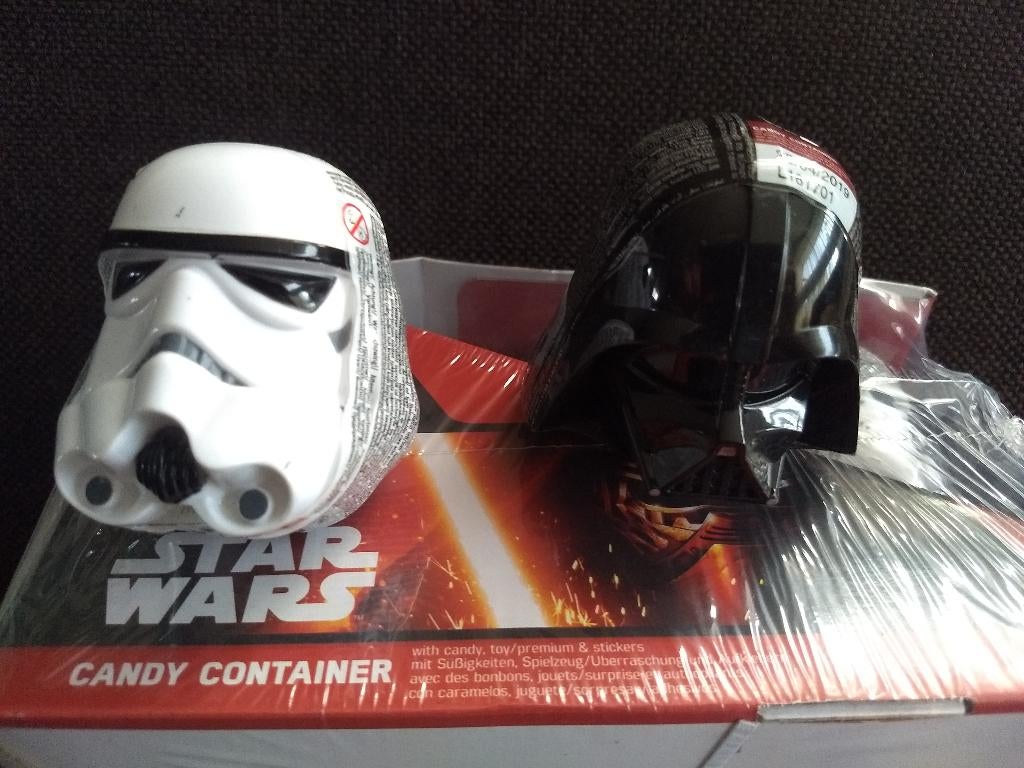 - Star Wars candy container.Star wars candy container. Verkoop verpakking van 18 stuks. Hoofden (ca. 7 Cm hoog) van darth vader en storm trooper gevuld met snoep. Prijs per verpakking € 7,50 leuk als verzamelobject. Snoep iNieuw Ophalen of Verzenden