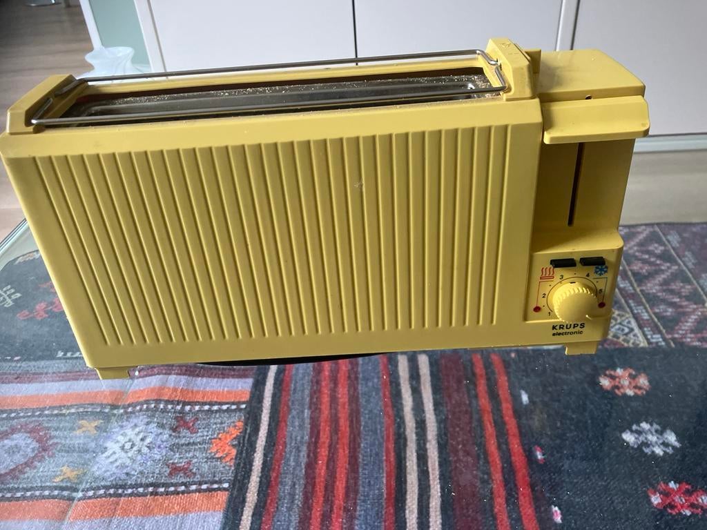 - Vintage broodrooster Krups electronicEen vintage broodrooster van het merk krups. Het is een geel model met een draaiknop voor de instellingen. Er zijn zes standen om uit te kiezen. Het broodrooster heeft ook een ontdooifunctie.Gebruikt Ophalen of Verzenden