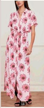 Fabienne chapot maat 40 mooie lange zomer jurk model sunny maxi dress leuke retro lange jurk in wit roze paars rood, tropische print, soort crepe stof mooie halslijn, verstelbare spaghetti bandjes, met strik detail op de rug (geschikt voor bh), goude...