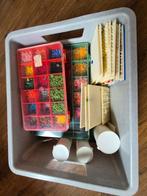 Ministeck. Bestaat uit: 2 gemaakte platen. Diverse oude voorbeelden. Bak met losse ministeck en 4 zakken met gesorteerd (donkerblauw, lichtblauw, lichtgrijs en goud) nieuwe verpakking strips, kleur go