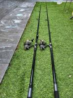 Complete karper visset bestaande uit 2 spro taifoon pro hengels, 2 dam quick big pit molens, dam foudraal (3 hengels), fox stalker plus rodpod (3 hengels), fox visstoel, fox brolly, onthaakmat, 2 schepnetten, jrc contact vistas en een doos met tackle...
