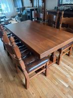 Zware eiken eettafel kersen gespoten met 6 stoelen leder zadelzit kun je heerlijk op zitten zitgedeelte stoel +/- 50 x 50 cm. 1 St