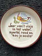 Charmant vintage spreuk bordje met de tekst 'leer van ‘t visje in het water, spartel rond en hou je snater'. Leuk decoratief item met een vrolijke afbeelding van een vis.