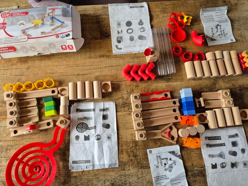 4 complete knikkerbanen excl. Knikkers van hout van merk playtive lidl 1 met doos de andere 3 zonder maar met boekje. Wel op platte ondergrond plaatsen! Op dikke vloerbedekking te wiebelig. Ziet er noZo goed als nieuw Ophalen of Verzenden