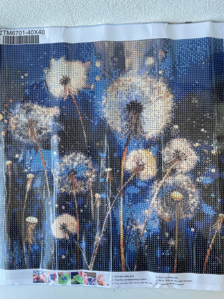 Dit is een diamond painting pakket met een afbeelding van uitgebloeide paardenbloemen. Het pakket is 40x40 cm en bevat alles om direct te beginnen. De instructies staan op de verpakking.