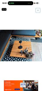 Deze hoekbank is gemaakt van hout en heeft donkergrijze kussens. De bank bestaat uit twee delen en een losse salontafel. De salontafel is ook van hout. Afmeting 2.5X 2.5 80 Centimeter diep en zithoogt