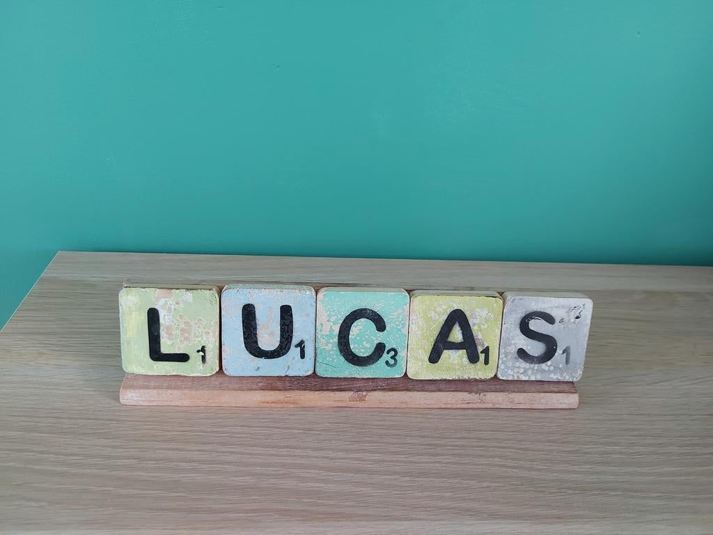 Leuk houten bordje met de naam lucas. De letters zijn los, waardoor ook de namen cas of luc gemaakt kunnen worden. Ideaal als decoratie voor de kinderkamer of als cadeau. In goede staat.Gebruikt Ophalen of Verzenden