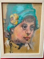 Dit charmante portret toont een meisje met een opvallende blauwe hoed, versierd met een gele bloem. Het schilderij is uitgevoerd in olieverf op karton en heeft een afmeting van 27 x 21 cm, inclusief d