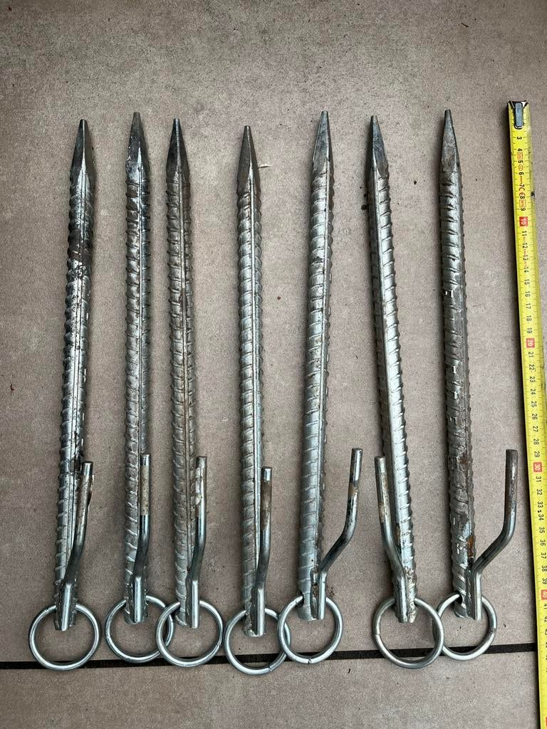Te koop aangeboden: 7 zware grondpennen van 41 cm lang en 18 mm dik. Ze zijn van staal en hebben een haak en een ring. Handig voor het vastzetten van een tent of luifel. Totaal gewicht circa 6 kilo, v