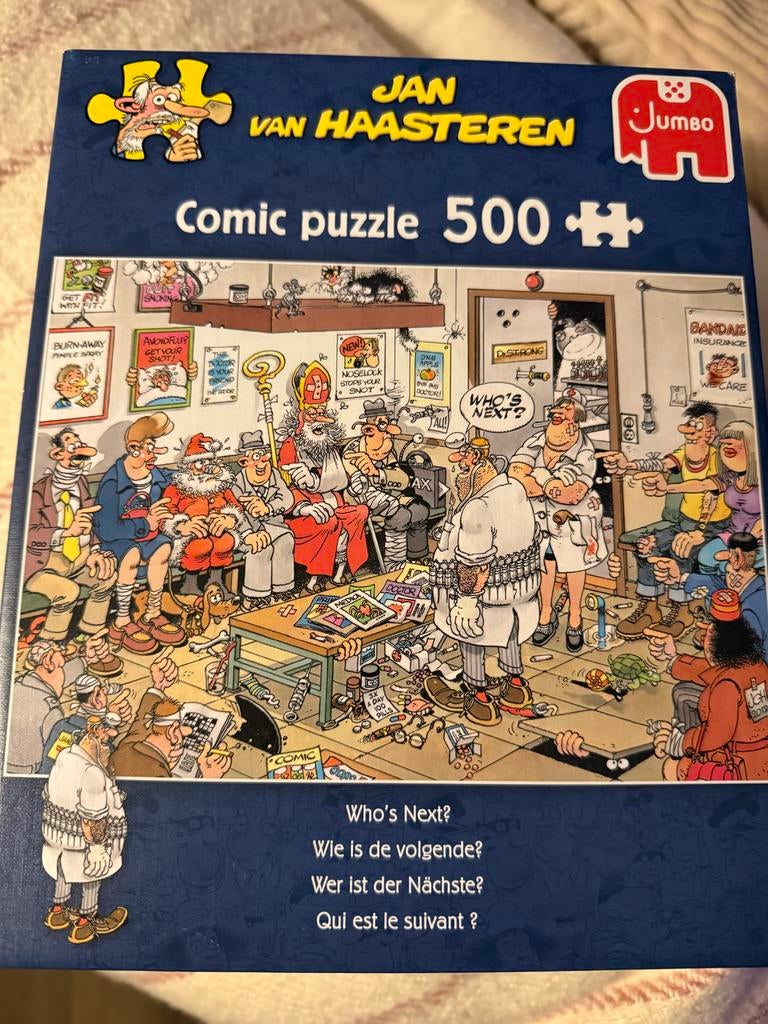 Leuke jan van haasteren puzzel met 500 stukjes. De puzzel heet 'who's next?' en toont een hilarische scène in een wachtkamer vol bekende jan van haasteren figuren. Compleet en in goede sta