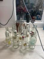 12 glazen flessen van verschillende maten te koop, leuk met beugeldop. Leuk om zelfgemaakte siroop oid in te doen. Sommige hebben