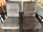 Set van twee comfortabele fauteuils met een moderne uitstraling. De stoelen zijn bekleed met een zachte, taupe stof en hebben een
