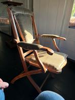 Prachtige antieke opvouwbare houten stoel met gestoffeerde zitting en rugleuning. Deze vintage stoel is perfect als decoratief stuk of als extra zitplaats. De stoel is inklapbaar, wat hem gemakkelijk