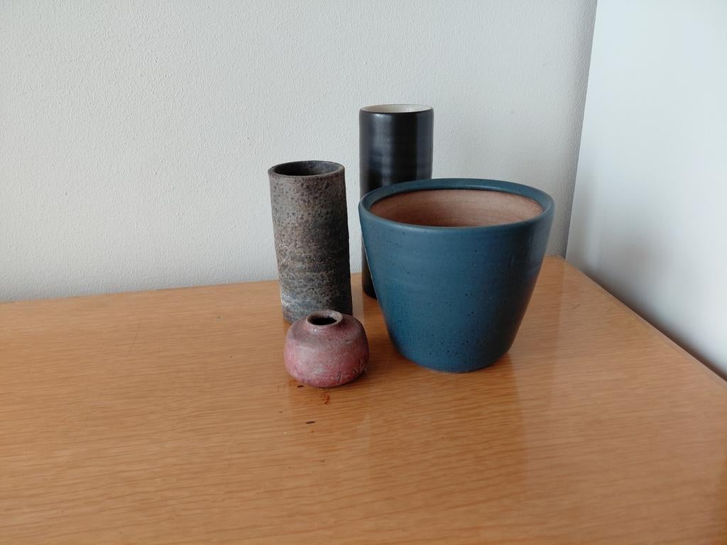 Een blauwe bloempot, twee lange smallere vazen en een klein vaasje van mobach. Alle vier gemerkt aan de onderzijde. Gebruikt maar in goede vintage staat. Bij verzending zijn kosten en risico daarvan vGebruikt Ophalen of Verzenden