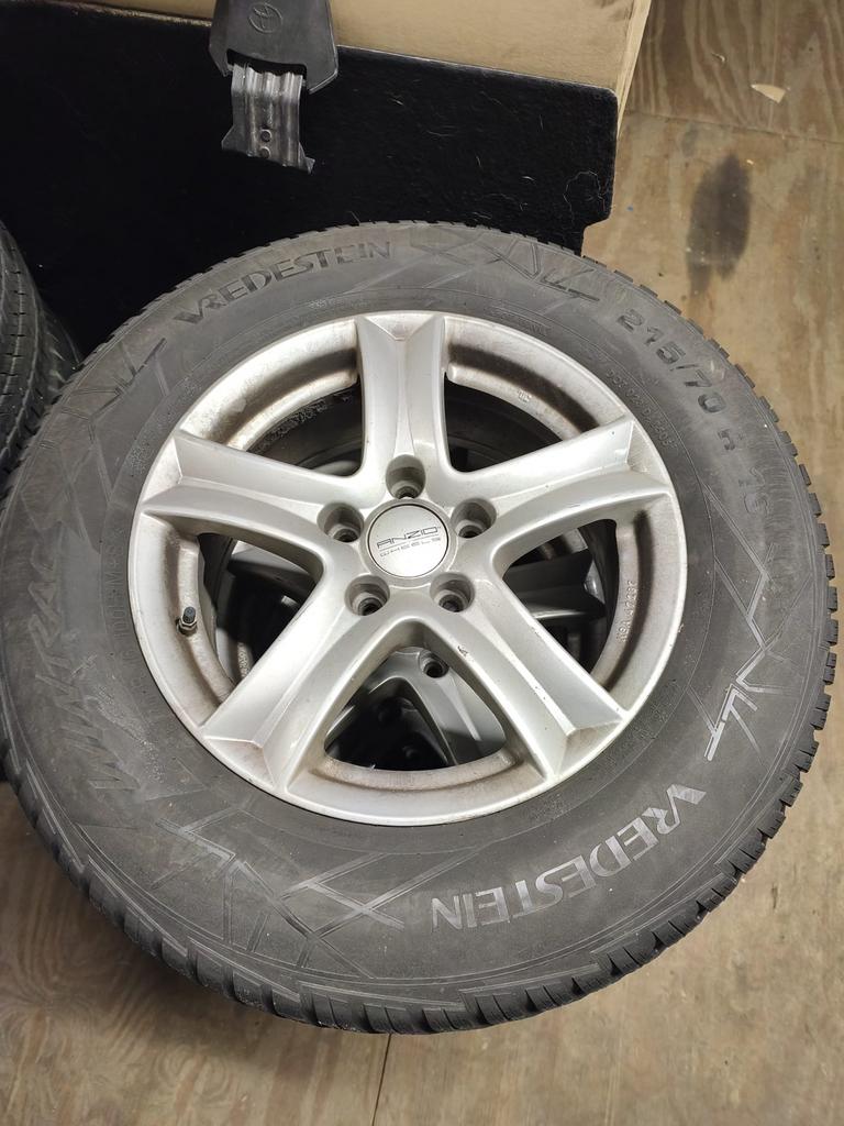 Complete set gebruikte winterwielen voor een toyota aygo. De set bestaat uit winterbanden gemonteerd op stalen velgen, inclusief wieldoppen. Perfect voor de wintermaanden voor extra grip en veiligheid