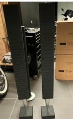 Set luidsprekers b&o, aluminium zilver met zwart speakerdoek. Doek is wat gerimpeld en bij 1 box doek beschadigd.