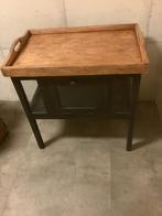 Prachtig oud vintage engels tafeltje op wieltjes. Met 1 lade. In stoer matzwart, met een oud grenen massief blad. Supermooi in een