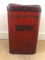 Vintage koffiebus van blik. De bus heeft een roestige rode kleur en het woord 'koffie' staat erop. Het blik heeft gebruikssporen en patina, wat bijdraagt aan de vintage uitstraling. Leuk als d