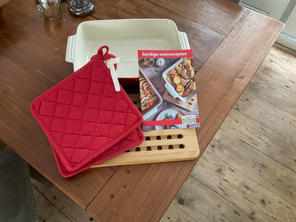 Complete set voor de oven: een ruime ovenschaal, twee rode pannenlappen en een houten onderzetter. Ideaal voor het bereiden en serveren van ovengerechten. De set is zo goed als nieuw en klaar voor geb