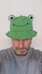 Leuk groen hoedje / vissershoedje / bucket hat met kikkerogen en kikker glimlach. Hij is mij iets te klein, dus ik schat 'm op maat 56/58 (staat geen maat in). Is nog als nieuw.