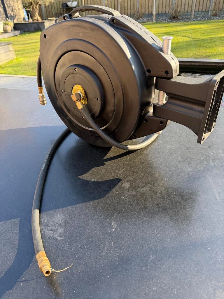 Deze compacte luchtslanghaspel is ideaal voor gebruik in kleine ruimtes. Hij is in gebruikte staat, maar werkt nog prima. Perfect voor de doe-het-zelver of professional die een handige en draagbare op