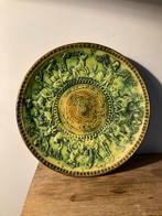 Prachtig antiek wandbord, vermoedelijk van portugese origine. Dit ronde bord heeft een diameter van 31 cm en is uitgevoerd in een opvallende groene kleur met gedetailleerde reliëfversieringen. Een uni
