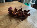 Super leuk retro/vintage eiersetje. Set bestaat uit schaal, 6 eierdopjes in de vormvast een kip en een zoutpotje afbeelding haan. 1 Eierdopje is beschadigd is te zien op foto11 zie alle foto’s op vrag