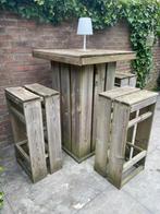 Houten bartafel met drie houten barkrukken (afmeting zie foto’s). Kan wel een schuurbuurtje gebruiken, maar verder nog prima. Doen