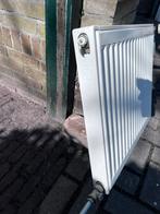Radiator van 60cm breed en 50cm hoog. Er zit een thermostaatknop op. De radiator is wit van kleur. Inclusief ophangbeugels.