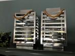Twee mooie windlichten met een metalen frame en een touw handvat. Ze zijn in goede staat en geven een sfeervol licht. Perfect voor binnen. De hoogte is minder dan 35 cm.