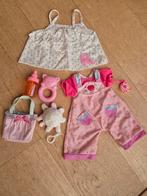 Leuk setje kleding en accessoires voor een babypop. Bestaande uit een broekpak, topje, tasje, flesje, rammelaar en knuffeltje. In goede staat.