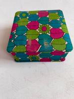 Super leuke doos, blauw, groen en roze. Afmeting ongeveer 15 cm x 15 cm x 6 cm. De bovenkant is wat verkleurd en heeft een slijt plek, aan de binnenkant is het papier een beetje beschadigd. Kijk ook e