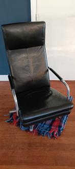 In uitstekend staat! Goede kwaliteit, dik, zwart leer met geen krassen, barsten of kale plakken. Je ziet aan de zit gedeelte dat erin gezeten is maar verder zo goed als nieuw. Rvs stervoet, drukknop v