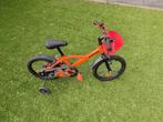 Oranje kinderfiets van het merk btwin, ideaal voor kinderen van 3 tot 5 jaar oud. De fiets heeft een wielgrootte van 16 inch en is voorzien van zijwieltjes, perfect om balans te leren. De zijwieltjes