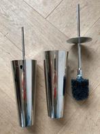 Mooie starck i duravit zeepbakje en drinkbeker, beide in nieuw staat. Afmetingen ophanghaken (circa): - doorsnede (ø) onder schijf: 5,5 cm - hoogte onder schijf: 0,8 mm - lengte tussen stuk (haak): 5,