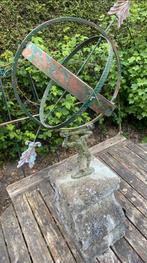 Een charmante vintage zonnewijzer, perfect als tuinornament. Het object vertoont tekenen van veroudering, wat bijdraagt aan de aut