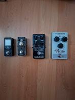 Een verzameling diverse gitaarpedalen, waaronder een tc electronic dark matter distortion pedaal, een tc electronic el mocambo ove