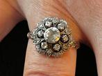 Gouden ring met 31 diamanten. Een grote van 6 mm in het midden, dus ongeveer 0,8 karaat? Daar omheen 6 kleinere van ongeveer 2,2 mm, daarom heen 6 nog kleinere en op de buitenrand 18 hele kleintjes. D