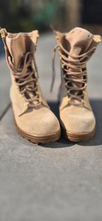 Hoge laarzen in een lichte kleur. Ze zijn nog nieuw en nooit gedragen. De zool heeft een grof profiel. De veters zijn ook licht van kleur. Incl extra paar veters.
