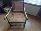 Charmante antieke stoel met rotan zitting en rugleuning. De stoel heeft een klassieke uitstraling en is voorzien van armleuningen.